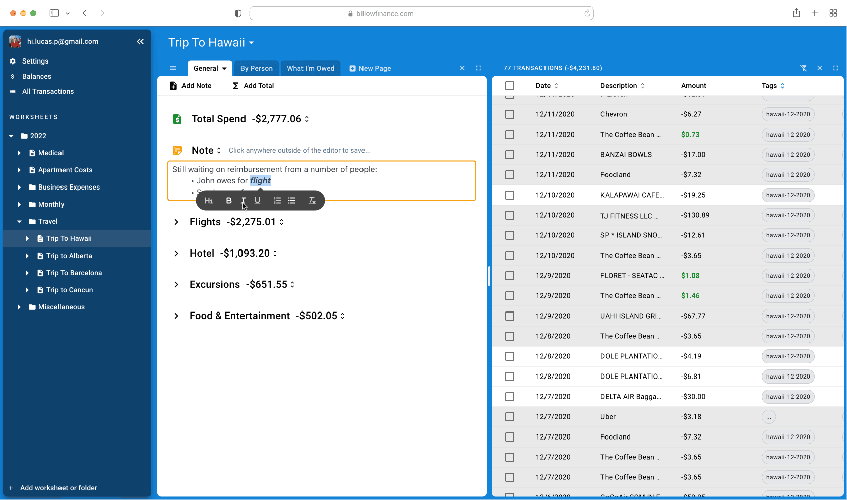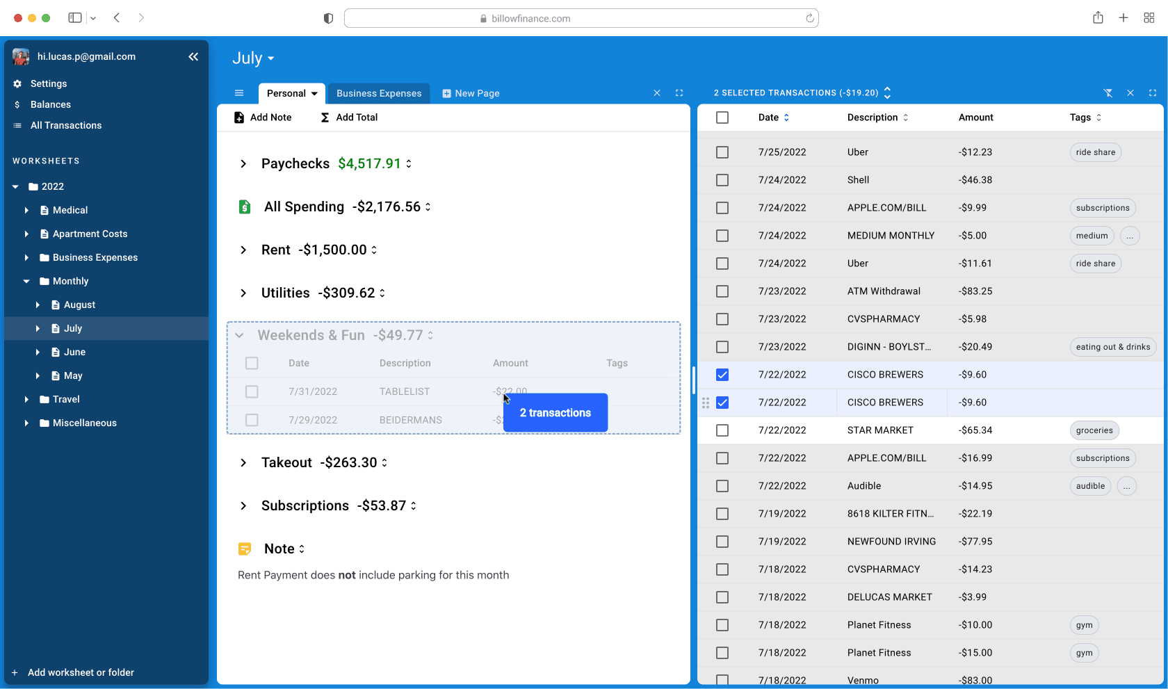 Everything! Drag and drop your transactions into worksheets to get organized your way. Billow is flexible!